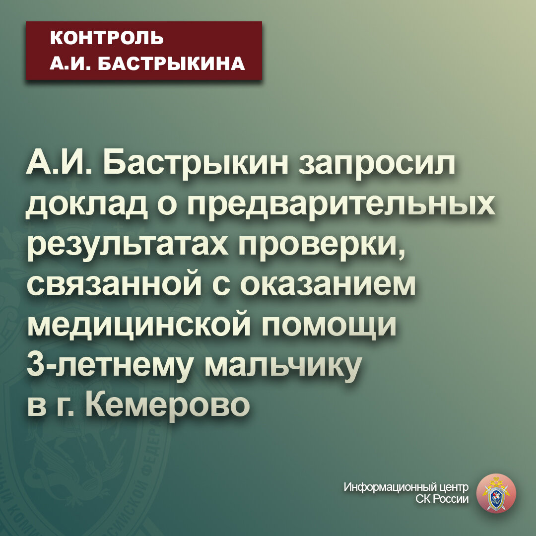 А.И. Бастрыкин запросил доклад о предварительных результатах проверки, связанной с оказанием медицинской помощи 3-летнему мальчику в г. Кемерово
