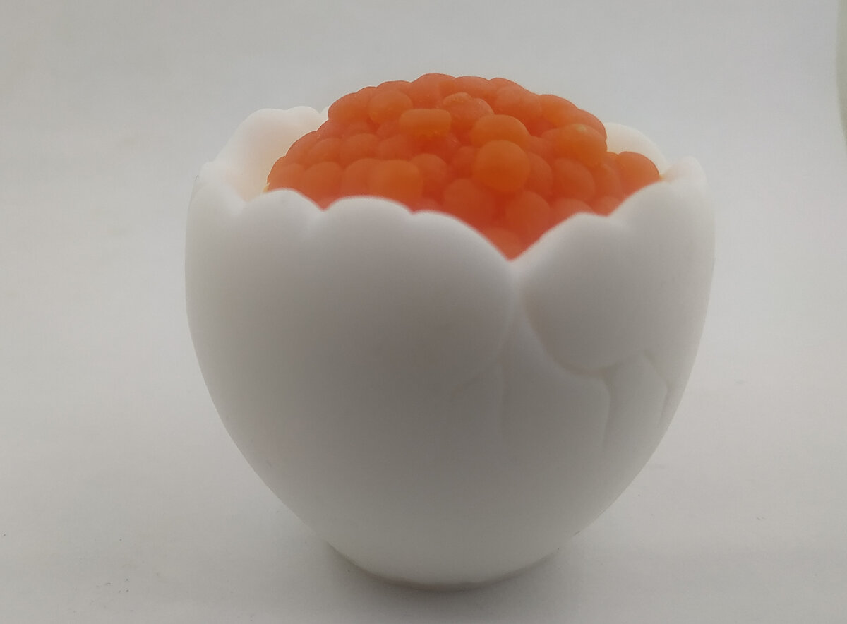 Здравствуйте! Сегодня пойдет речь о силиконовой форме для мыла "Яйцо с икрой". И в данной статье мы посмотрим как ее можно залить в два цвета. В конце статьи будет размещен рецепт. Разделяется мыло на слои достаточно просто. На дне формы можно увидеть углубление в виде икринок, по краю которых есть небольшой бортик. Туда и пойдет первая заливка. При этом желательно соблюдать осторожность - если мыло перельется за обозначенный выше борт, то конечный результат будет не очень хорошим. Для имитации икры рекомендуется брать прозрачную основу, она сделает ее более натуральной. Красители добавленные для данной заливки этого слоя - солнечный лимон и красный кристальный в пропорции примерно 1:1. Насыщенность цвета и пропорции можно варьировать, четких условий здесь нет. После затвердевания мыла можно залить основную часть формы. В нашем случае взята обычная белая основа без добавок. Дело в том, что автор статьи и по совместительству человек делавший описываемую заливку до конца не смог понять