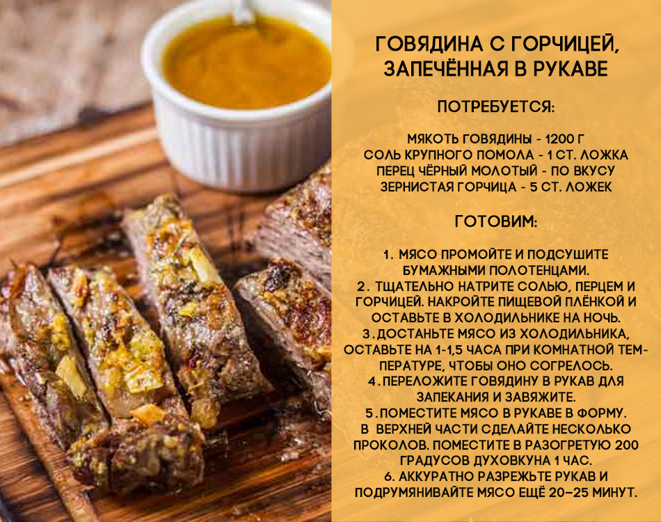 ГОВЯДИНА С ГОРЧИЦЕЙ, ЗАПЕЧЕННАЯ В РУКАВЕ ГОВЯДИНА, ТУШЕННАЯ В ДУХОВКЕ С ОВОЩАМИ И ВИНОМ ГОВЯДИНА С КРАСНОЙ ФАСОЛЬЮ И БУЛГУРОМ