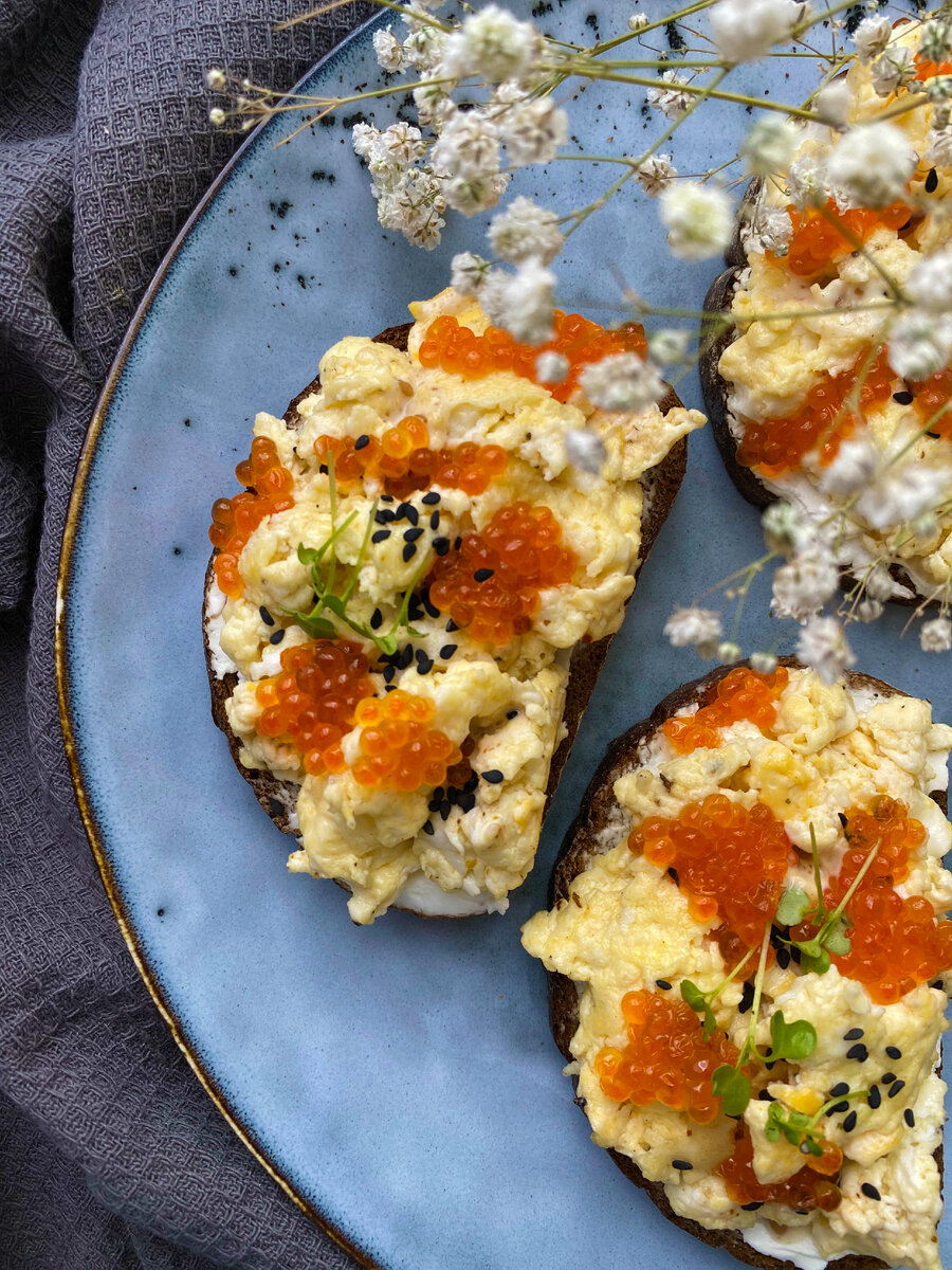Ингредиенты: ▫️икра нерки, 2 ст.л; ▫️ржаной хлеб, 2 ломтика; ▫️творожный сыр, 2 ст. л.; ▫️яйцо, 2 шт; ▫️сливки 35%, 2 ст.л; ▫️соль/перец, по вкусу; ▫️кунжут, для красоты; ▫️микрозелень, для красоты. ПРИГОТОВЛЕНИЕ:⠀ Хлеб подсушить на сухой сковороде или в тостере. Смазать творожным сыром. Яйца разбить на холодную (!) сковороду. Добавить 2ст. л. сливок и поставить на средний огонь. Готовить, помешивая лопаткой. Важно не пересушить, консистенция должна быть кремовой. Посолить и поперчить Выложить яйца на хлеб. Сверху добавить икру. Украсить кунжутом и микрозеленью.
