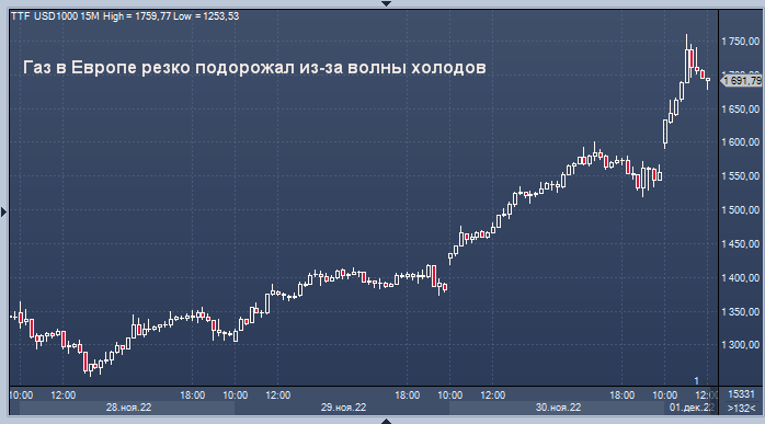 График цены ближайшего фьючерса на спотовый индекс газа TTF на бирже ICE Futures (в долларах США за тысячу кубометров) интервалами в 15 минут