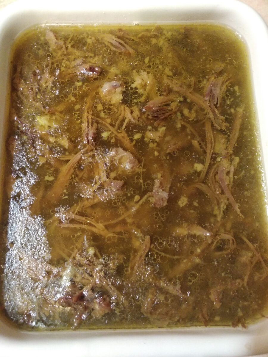 Бульон процедить, добавить измельченный через пресс чеснок, соль (бульон должен быть чуть пересолен). Перемешать бульон и залить им измельченное мясо.