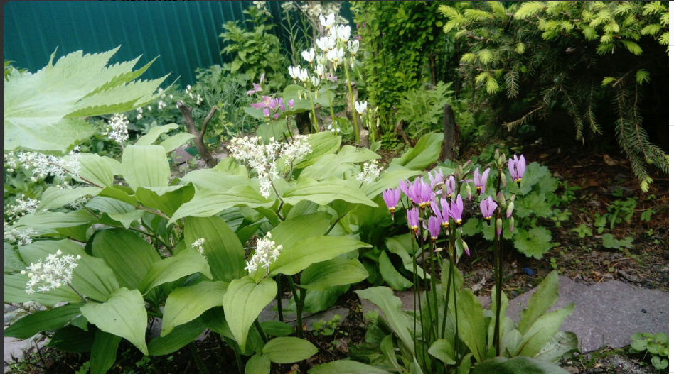 Мои любимые читатели! Знакомы, нет ли - но расскажу про ДОДЕКАТЕОН -Род травянистых растений семейства Первоцветные, живут в Северной Америке и.... на Чукотке! Любит влажные, тенистые места и чуть кислый грунт. Вот немного моих додекатеоновых жителей , второе имя ДРЯКВЕННИК, история садовая их разная, рассмотрим. А существуют они в тенистом месте, смилацину - убрала, уж очень шустра, будут в это время они одни, на свободе, под сенью елки и подрастающиих двух горных сосенок. Цветут в мае. Их - несколько, из разных источников. Правда, разницы не вижу, с сортами не заморачиваюсь, отношусь проще и считаю, что всего два - сиреневый и белый. Белый - выше и крупнее, листья больше. У приятельницы листья - еще больше , в два раза, там точно сорт какой-то, цветения не видела, чтоб рассказать. Первый, наверно, родитель всех сиреневых - вырастила из семян, причем - купленных в магазине. Сеяла весной 2011 года,почему запомнила год - еще жива была моя огромная рыжая песка, рядом с ее жильем был