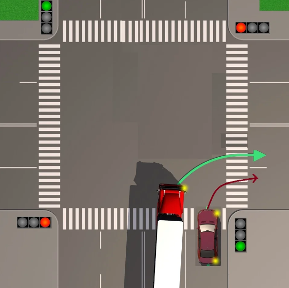 Недавно меня консультировал водитель, которого сбил грузовик на перекрестке таким образом. Водитель грузовика не был убежден в своем правонарушении и объяснил, что водитель автомобиля сам заехал под грузовик. Инспектор дорожной полиции, расследовавший обстоятельства аварии, признал обоих водителей виновными. Водитель грузовика нарушил Правило дорожного движения 8.7, повернув направо в нарушение Правила дорожного движения 8.5, тем самым не обеспечив безопасность движения и создав помехи для движени