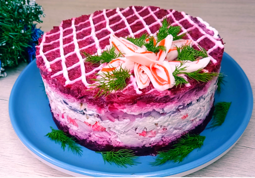 Видео - рецепт: Сегодня приготовим праздничный слоеный салат на Новогодний стол. Готовится салатик просто и продукты все доступные. И так приступим, подготовим все ингредиенты. 1. Мелким кубиком нарежем репчатый лук я взяла фиолетовый лук по весу 200 грамм. 2. нарезанный лук перекладываем в миску добавляем, половину чайной ложки соли, половину чайной ложки сахара и 2 столовые ложки уксуса Я добавляю 9% (процентный) яблочный уксус все хорошо перемешиваем и оставляем лучок мариноваться. 3. А теперь измельчаем отварные яйца их можно Просто порезать ножом но я сегодня воспользуюсь толкушкой, получается быстро просто. 4. Крабовые палочки по весу 300 грамм нарезаем небольшим кубиком 5 Далее 500 граммов вареной или запеченной свеклы натираем на крупной терке. Если у вас свекла сочная как у меня, ее необходимо отжать 6. Теперь к свекле добавляем 1 зубчик чеснока натираем его на мелкой терке Пол чайной ложки соли по вкусу и 3 столовые ложки майонеза все хорошо перемешиваем Как пригото