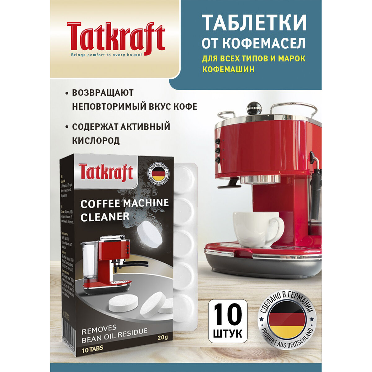 Инструкция по применению Для кофемашин с программой чистки: Снимите защитную пленку с таблетки и поместите ее в емкость для воды. Налейте теплой воды и дайте таблетке раствориться. Включите прибор. Далее следуйте командам на дисплее и инструкции производителя вашей кофемашины. Получившийся раствор вылейте. Повторите процедуру 2-3 раза, используя чистую воду. Кофемашины других типов следует чистить в соответствии с рекомендациями производителя прибора. Меры предосторожности: Хранить в недоступном для детей месте. Избегать попадания в глаза, контакта с кожей. Вызывает сильное раздражение глаз. При попадании в глаза тщательно промыть водой. Состав: > 30% фосфаты, 15-30% кислородный отбеливатель, <5% неионогенные ПАВ, <5% фосфонаты 10 таблеток по 2 г / Масса нетто 20 г Сделано в Германии