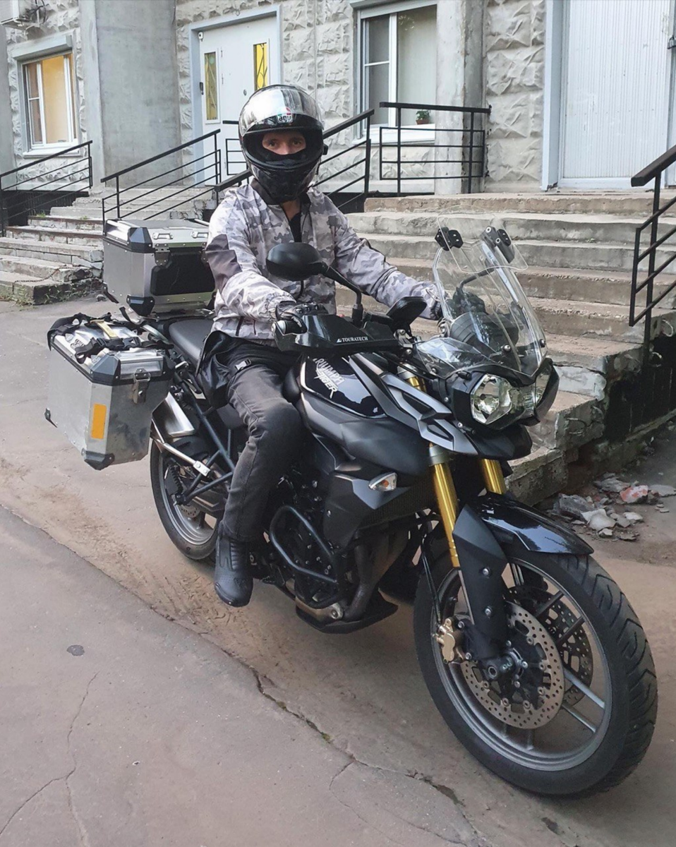 Мы заправились, выезжаем на платную трассу. Едем часа два, вдруг начинаются пробки. Я не понимаю. Откуда на платках пробки? Обычно я не езжу по таким дорогам и не знаю про их загруженность. Ну да ладно, начинаем протискиваться в пробке, прошу не забывать ширину «Тигра», особенно с боковыми кофрами. И вот в какой-то момент я вижу в зеркале заднего вида мотоциклистов, они так же двигаются в междурядье. По обыкновению я решаю их пропустить, т.к. нам спешить некуда. Мы из междурядья пристраиваюсь за машиной в ряд и боковым зрением «мониторю», что происходит. Проехал первый мотоциклист, проехал второй. Я начинаю не глядя перестраиваться обратно в междурядье. В последний момент бросаю взгляд в зеркало заднего вида и вижу в нём третьего мотоциклиста… Блин! Спокойно отклоняю байк обратно в сторону машины в полосу и поворачиваю голову и как в замедленной съемке провожаю взглядом третьего байкера. Красив, тоже какой-то туристический эндуро. Эх, все же это лучшие мотоциклы на земле. Неспеша возвращаю взгляд по направлению движения и понимаю, что в паре метров от меня остановившаяся машина, а я еду около 15-20 км/ч. Хватаюсь за ручку тормоза. Мы врезаемся в автомобиль, чуть не перелетев через руль ударяюсь кхм, причинным местом об бензобак, шлемом о ветровое стекло мотоцикла сзади мне в шлем бьется своим шлемом Светлана. Прекрасно подумал я. Чудом не перелетев и не уронив байк, я выставляю подножку, прошу спутницу слезть. Дверь автомобиля открывается и выходит дед лет 60-70, я думаю про себя «ну всё, это до утра теперь». И ведь так обидно за столько лет первая авария. Да ещё и так нелепо спустя 2 часа после начала отпуска.
