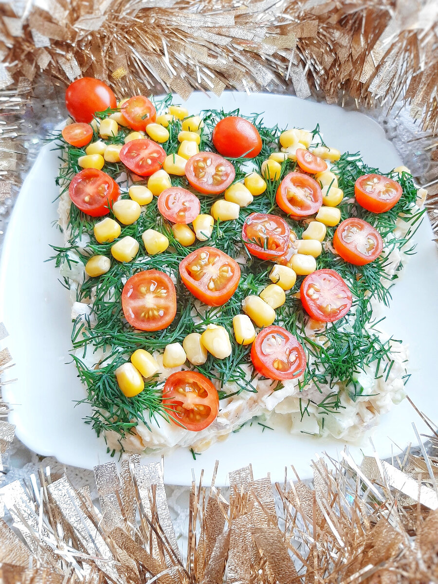 Этот нарядный новогодний салат прекрасно подойдёт к оформлению праздничного стола. Рецепт приготовления прост и не доставит лишних хлопот. 🎄КБЖУ на 100 г.: 137 ккал 8.7/9/5.3 Выход: 710 г. 🎄Ингредиенты: Ветчина - 150 г., (у меня из курицы 130 ккал). Яйцо куриное - 2 шт. Сыр лёгкий - 70 г., у меня "Natura" 260 ккал. Огурец свежий - 100 г. Кукуруза консервированная - 100 г. ▫️Для пп майонеза: Сметана 10% - 150 г. Горчица дижонская - 10 г. Масло растительное нерафинированное - 10 г. Сироп топинамбура или мёд - 1 ч.л. Яблочный уксус - 1 ч.л. Зира - 1/2 ч.л. Кориандр - 1/2 ч.л. Соль и перец по вкусу. ▫️Для украшения: Укроп. Помидоры черри - пара штучек. Консервированная кукуруза. 🎄Приготовление: 1️⃣ Два яйца отвариваем, остужаем, чистим и нарезаем кубиками. 2️⃣ Сыр натираем на мелкой тёрке. 3️⃣ Ветчину нарезаем кубиками. 4️⃣ Огурчик чистим и нарезаем кубиками. 5️⃣ Для соуса смешиваем: 150 г. сметаны, по 10 г. масла и горчицы. По одной чайной ложке сиропа топинамбура или мёда и яблочного