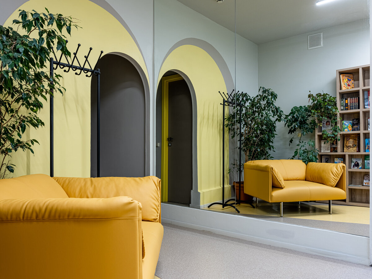 В игровой стилистике выдержаны не только детские, но и взрослые помещения обновлённого садика — такие, как кабинеты администрации и зона ресепшен.