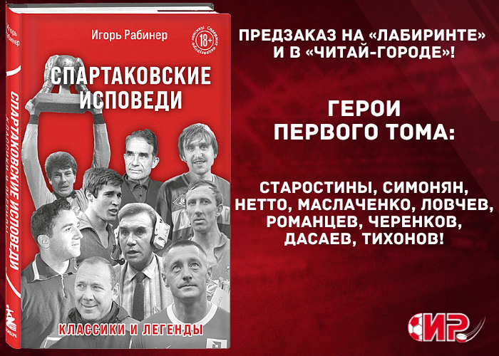 Герои: Старостины, Симонян, Нетто, Маслаченко, Ловчев, Романцев, Черенков, Дасаев, Тихонов! Привет, с вами Игорь Рабинер. В ближайшие недели выходит в свет первый том двухтомника «Спартаковских исповедей», и на него уже можно сделать предзаказ: На «Лабиринте» В «Читай-городе»