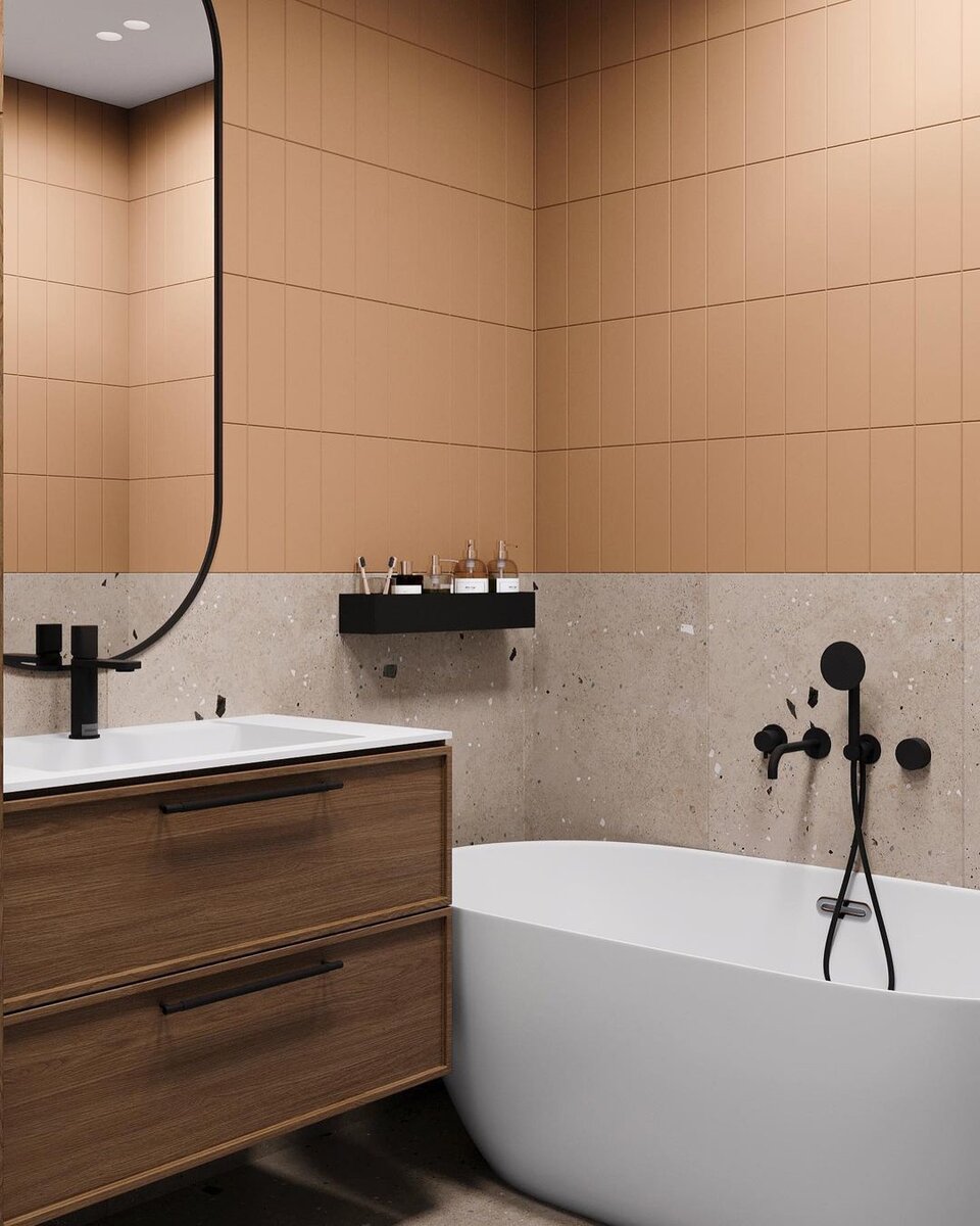 Здравствуйте и добро пожаловать на канал DESIGNER. Подписывайтесь и ставьте лайки - это очень помогает развитию канала. Что делать, если тебе нравятся простые и лаконичные решения в интерьере, но при этом в подобных дизайнах не хватает красок? Внести в оформление один неярко выраженный акцент, который добавит насыщенности, но не будет чрезмерно подавлять атмосферу. Сегодня мы рассмотрим очень утончённый и, я бы сказал, аккуратный интерьер ванной комнаты. В неё имеется один акцент, но он так плавно и ненавязчиво вплетается в дизайн, что назвать его доминирующим не получается. Стены горизонтально разделены пополам. Нижнюю часть было решено отделать кафелем, имитирующим бетонную кладку с вкраплениями. Точно также оформлен и пол. Верхняя половина стен отделаны вытянутой плиткой персикового цвета. Достаточно оригинальное сочетание оттенков, которое встречается нечасто. Переходим к наполненности ванной комнаты. Напротив входа мы видим подвесную тумбу из тёмного дерева со встроенной раковиной