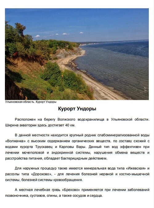 Ульяновская область. Карта курорта: Это единственное в России месторождение минеральной воды с таким содержанием. Благодаря географическому расположению, в регионе поддерживается режим щадящего ультрафиолетового излучения (этот фактор используется в оздоровительных программах местных санаториев). Поэтому здесь, не опасаясь солнечных ожогов, можно получить красивый загар, – благо, что купальный сезон в данной местности длится 80 – 100 дней в году. А из-за горюче-сланцевых пород, слоями выходящих на берег водохранилища (и обладающих повышенной природной радиоактивностью), – в этой местности в воздухе поддерживается повышенный уровень ионизации, который схож с характеристиками горного воздуха (~ 1000 м над уровнем моря). Такая насыщенность аэроионами снимает напряжение организма, повышает тонус нервной системы, оказывает положительное влияние на свойства крови, на дыхательную систему, улучшает обмен веществ, – что в итоге приводит к омолаживающему эффекту. Приглашаю посетить данный курор