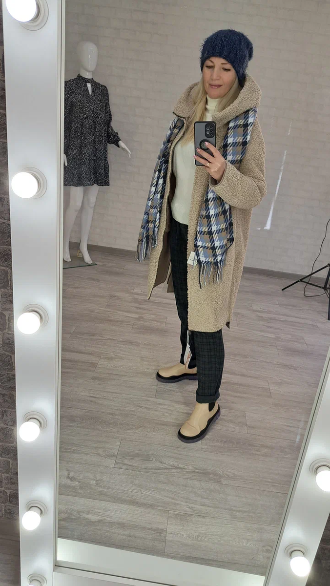 Такое пальто осталось 48 размера. Палантин и шапка, впрочем, как и свитер с брюками (да и платье на заднем плане), тоже можно купить.