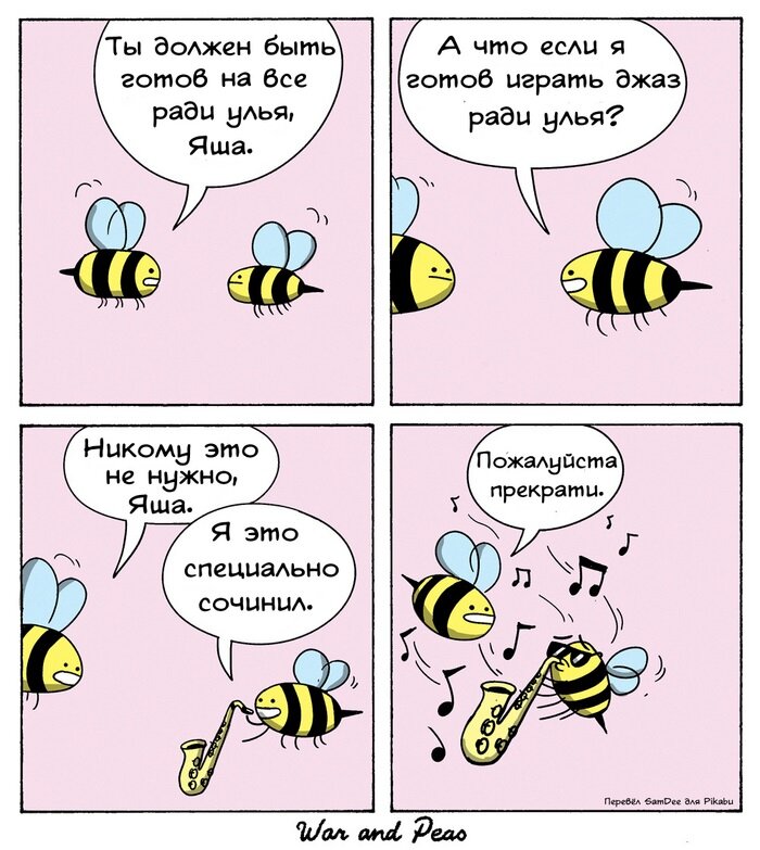 Привет, дорогой друг! Сегодня, мне хотелось бы поговорить о музыке. Музыка — это настоящее искусство… было таковым, сотни лет назад. К сожалению, сегодня далеко не все песни несут в себе глубокий смысл и вызывают какие-то положительные эмоции. Нет, я ничего не имею против современных исполнителей. Но иногда, прослушивая очередную хитовую песню, задаюсь вопросом — а что это было? Но давайте не будем о грустном и посвятим эту подборку комиксов веселым и жизненным ситуациям из мира музыки, песен и музыкальных инструментов. Бывало ли с вами такое, когда друзья категорически не поддерживают ваши музыкальные пристрастия? К сожалению, так случается не только в человеческом, но и в пчелином мире. Хотите посмотреть на это со стороны? Тогда читайте комикс от авторов War and Peas. Оля кузнецова следующего комикса Xitrijlis знает толк в мимишности. Поэтому, решил показать, как приятно засыпать под хорошую музыку четвероногому пишистику. Бывало ли с вами такое, что определенной песней вы хотели дон