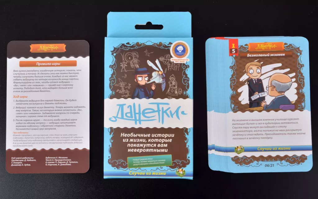 Продолжаем серию игр, которые, по моему мнению, могут зайти на Новый Год или вообще, разбавить любые другие посиделки. "Данетки" — это короткие истории, поначалу совсем и никому непонятные. Мужчину арестовали после того, как он посмотрел в окно. Женщина вычислила скупцов по цветам. Студент сдал экзамен, не сказав ни слова. Что всё это значит и что произошло на самом деле? Разобраться — ваша задача. Задавайте правильные вопросы — и всё узнаете. Вы не поверите, но, всё это действительно истории из жизни! Задаём ведущему вопросы, на которые можно ответить «да», «нет» или «неважно». И разгадываем данетку. Именно в этой части издания (их много, да) у каждого из вас только четыре вопроса. После каждого круга вопросов — то есть, когда каждый игрок задаст свой — ведущий зачитывает одну подсказку. Подсказка отнимает одно победное очко. То есть, чем быстрее вы разгадаете данетку, тем больше очков получите. Такие правила хорошо подходят для конкурсов на вечеринках и корпоративах. Эта игра максима