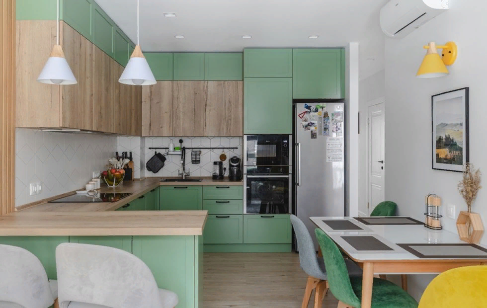 Из ПИКовской застройки с типовой отделкой, создание стильного интерьера с яркими акцентами Вкратце Оформление в супер-стильную квартиру для семьи с двумя детьми. Из типовой трешки в новостройке превращение в полноценную четырехкомнатную квартиру со всеми необходимыми функциональными зонами. На 86 м² - четыре комнаты, два санузла, гардеробная, кабинет и постирочная. Подробности Кухонный гарнитур разместили углом и продлили, чтобы получилась удобная барная стойка с системами хранения. Чтобы использовать пространство по-максимуму, шкафы сделали до потолка — там хранятся вещи, которыми редко пользуются. Отдельно стоящий холодильник вписали в гарнитур, рядом спроектировали шкаф со встроенной бытовой техникой. Еще один встроенный морозильник находится рядом с варочной поверхностью. Зона гостиной отделена от кухни барной стойкой и обеденным столом. Она получилась небольшая, но очень уютная. Чтобы увеличить количество посадочных мест, использовали пространство около окна. Радиатор убрали в кор
