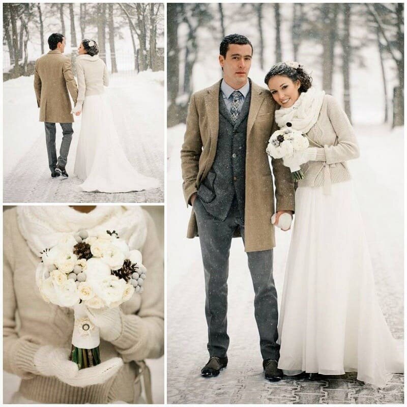 Какой бы ни была погода, молодоженам хочется выглядеть особенно красиво в этот день. В холодное время года образы должны быть стильными, романтичными и теплыми одновременно. Стоит подобрать плотные ткани в одежде, аксессуары и декор должны соответствовать сезону. Очень хорошо смотрятся меховые и вязаные элементы в одежде. Так как зима — это время сверкающего снега и ярких огоньков, хорошо добавить в образ блестящие, серебристые или золотистые детали.