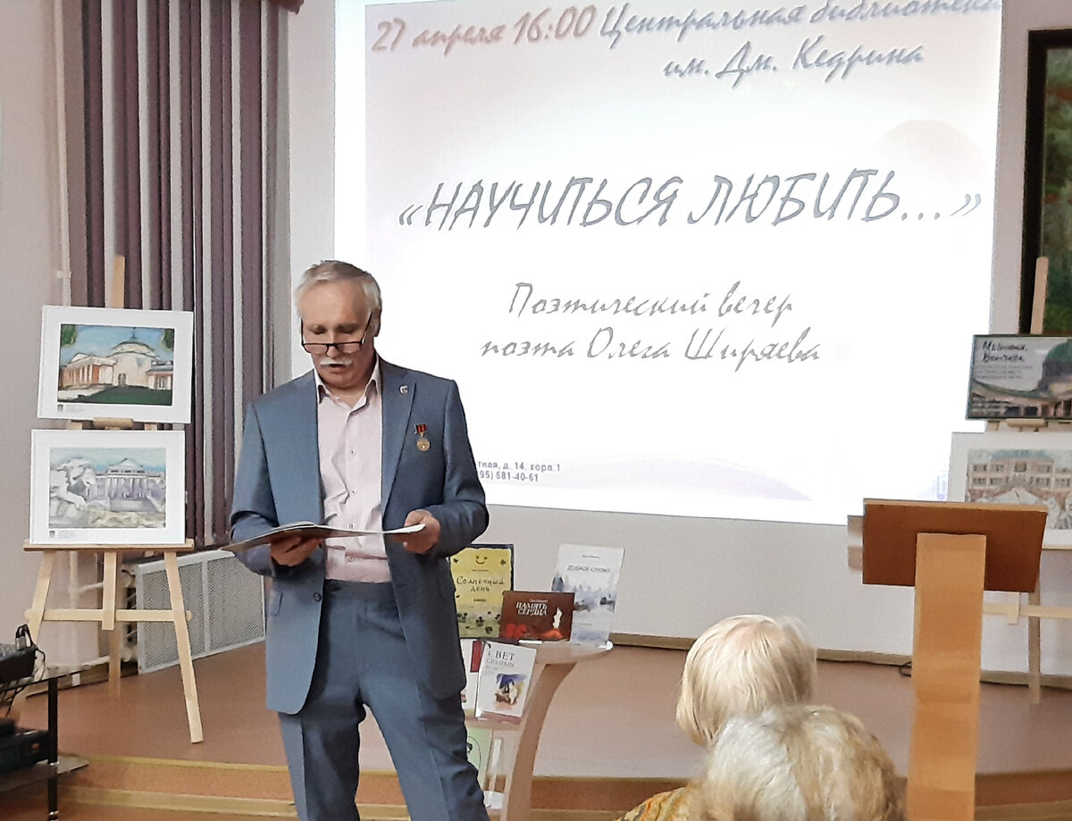 27 апреля 2022 года в библиотеке им. Дмитрия Кедрина (Мытищи, Московской области) прошла встреча с читателями мытищинского поэта и художника, автора нескольких поэтических сборников, книг для детей Олега Ширяева под названием «Научиться любить». На сегодняшней встрече с автором звучали его стихотворения, размышления о темах божественного мироздания и патриотичности, лирика природы переплеталась с лирикой человеческих чувств. Участники встречи аплодисментами приветствовали каждое стихотворение поэта и долго расспрашивали его о природе поэзии.
