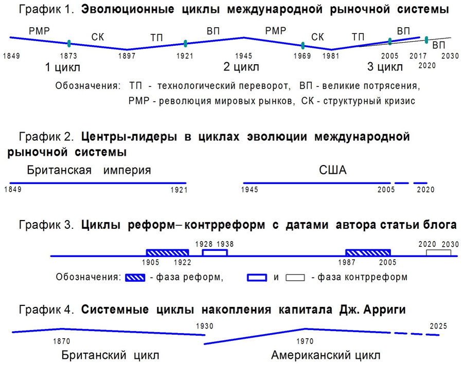 8.3. В статье [Блог 2020.17] рассмотрена концепция циклов российских реформ-контрреформ В. И. Пантина, В. В. Лапкина, которая связывает этапы российских реформ и контрреформ с большими циклами Н. Д. Кондратьева и с эволюционными циклами международной политической и экономической системы тех же авторов.