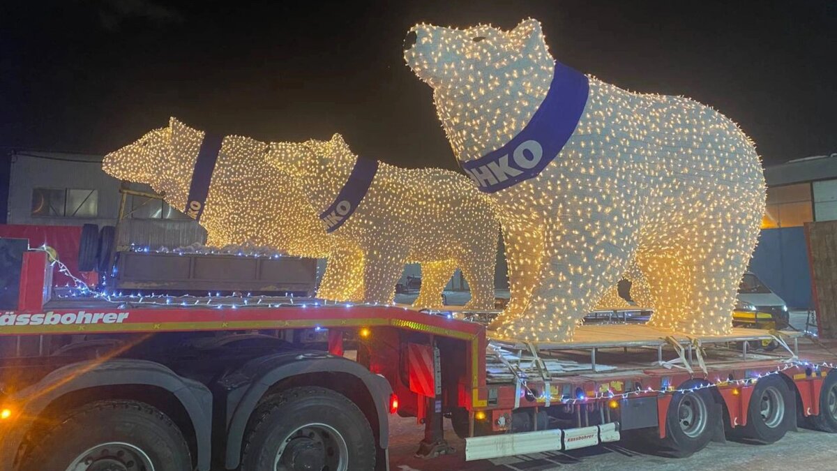 В Тюмени накануне вечером горожане заметили белых мишек. Четыре светящиеся фигуры косолапых разместили на КАМАЗах и провезли по улицам города. Медведи выехали с Одесской в 19:00 и последовали по главным улицам Тюмени. Маршрут пролегал по Широтной — Мельникайте — Федюнинского — Червишевскому тракту– Мориса Тореза — Герцена — Первомайской. Конечной точкой стал Цветной бульвар у Цирка. Сегодня здесь состоится праздничное мероприятие. Ранее мы рассказывали, что арктический Дед Мороз встретится с детьми Надыма и Аксарки. Самые актуальные новости — в нашем телеграм-канале «Ямал-Медиа».