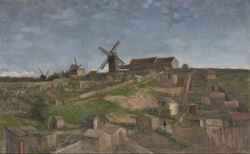 В конце февраля 1886 года Ван Гог прибыл в Париж. Там он планировал дальше развиваться как художник, а также надеялся продать свои работы в городе. Он переехал к своему брату Тео. Их маленькая квартирка находилась у подножия Монмартра на северной окраине города. В то время этот холм был еще почти без построек и носил сельский характер. Весной Ван Гог исследовал окрестности. Он нарисовал эту панораму холма Монмартр, вид с севера, на открытом воздухе. Его сдержанная осенняя палитра преимущественно красно-коричневого и коричнево-жёлтого цветов ещё напоминала голландский период художника. Но в живописном использовании разных оттенков зелёного, синего и белого он уже осторожно экспериментировал с цветом и светом. Почти квадратный мазок чуть правее центра на небе — это ретушь, которую применил сам Ван Гог. Это произошло потому, что в слое краски образовалась дыра, из-за которой был виден нижний слой. Мазки вокруг него, возможно, несколько замаскировали эту слишком заметную коррекцию.