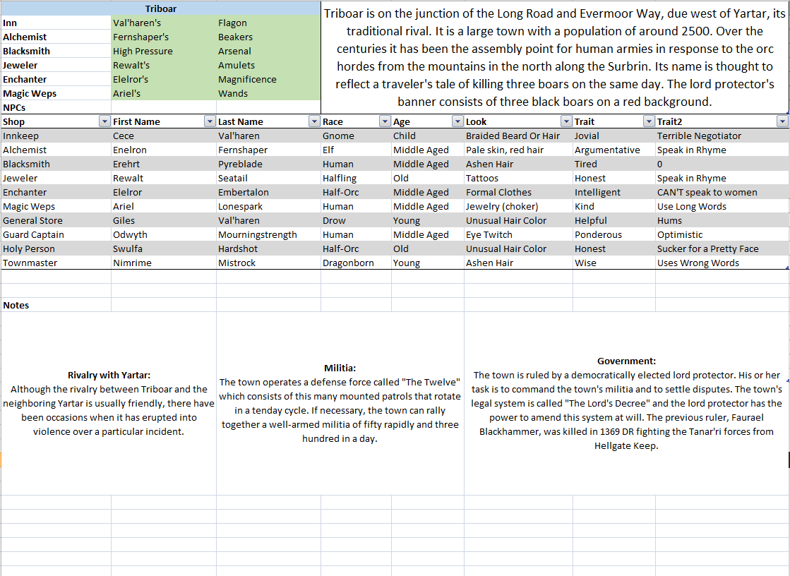 Генератор локаций Если коротко, то этот генератор представляет собой Excel-файл, в котором представлено очень много информации о трактирах, лавках и товарах в них. Информация генерируется автоматически при повторном открытии файла или нажатии клавиши F9 (в Excel эта клавиша обновляет данные/страницу). Какие возможности у файла? Теперь подробнее о том, что этот файл предлагает. Как только вы его откроете, то увидите самый первый и основной блок: Правая верхняя таблица — генератор названий. Трибор, один из городов Забытых Королевств, служит примером для генерации. В списке представлены следующие заведения (по порядку): Чуть ниже идет детальный разбор того, кто управляет этими заведениями. Для каждого из управляющих написано имя, фамилия, раса, возраст, внешний вид, а также две основные черты характера. Все это поможет вам легко описать и отыграть NPC, потратив при этом минимум времени. На этой же странице справа есть выделенные оранжевым цветом таблицы: Вот здесь и начинается самая интер
