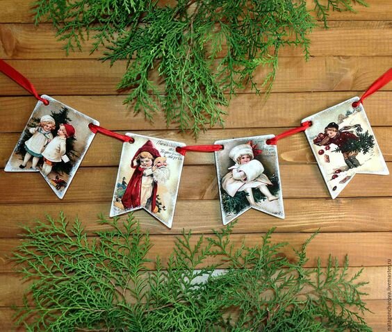 Один из атрибутов русского нового года, конечно же бумажные флажки. С советскими или дореволюционными сюжетами. Их можно приобрести на интернет магазинах Озон, Лабиринт Украсить елку игрушками в русском стиле. Шикарные игрушки производят российские фабрики "Елочка" и "Ариэль" Самые разнообразные украшения из шишек Елка с дождиком, бусами и Вифлеемской звездой или Ангелом на макушке Украшения из красного фетра с золотой вышивкой или деревянные игрушки. Можно повесить на елку, украсить букет из хвойных веточек или подвесить на окно Вырезать из бумаги силуэты матрешек или Петрушки, украсить окно или люстру Добавить в интерьер белый текстиль с красным рисунком Украсить окна снежинками из бумаги Создать композицию из хвойных веточек и рябины Приобрести в коллекцию елочные шары Жостово