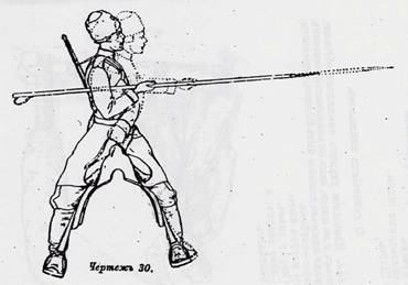И все. Больше ничего. Не то что об отбивах, а даже и о нанесениях ударов в разных направлениях, хотя бы направо и налево, речь вообще не идет. Механика нанесения удара также не описывается. Судя по всему, подразумевается (хотя прямо и не сказано), что удар должен быть самый простой - пассивный и вперед, зажав пику под мышкой, как показано на рисунке. Ну, просто ничего иного не предложено...