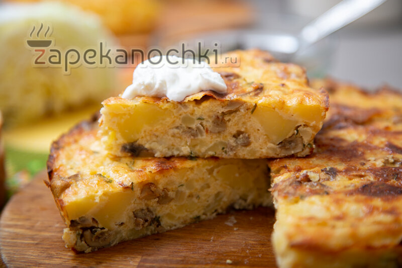 Здравствуйте, дорогие читатели! Это мой самый любимый и в то же время простой рецепт запеканки. В готовом продукте отчетливо чувствуется аромат грибов со сметаной. Блюдо отлично держит форму, не разваливается, но получается очень мягким и вкусным. Можно взять как перекус на работу. Попробуйте! Рецепт запеканки с картофелем и грибами 1. Грибы подойдут свежие тепличные (шампиньоны, вешенки) или замороженные (у меня этот вариант). Нарезаем грибы и лук. Обжариваем с небольшим количеством растительного масла до легкого румянца. Немного солим, добавляем сметану, перемешиваем и обжариваем не более минуты. Оставляем остывать. 2. Картофель очищаем и отвариваем. Он должен протыкаться вилкой, но не должен разваливаться. Сливаем с него воду и остужаем до комнатной температуры. Затем толчем толкушкой. Блендер лучше не использовать, наоборот, будет лучше, если останутся кусочки картошки. Так блюдо лучше схватится и останется плотным, не будет разваливаться. Добавляем еще чуть-чуть соли. В общей сло