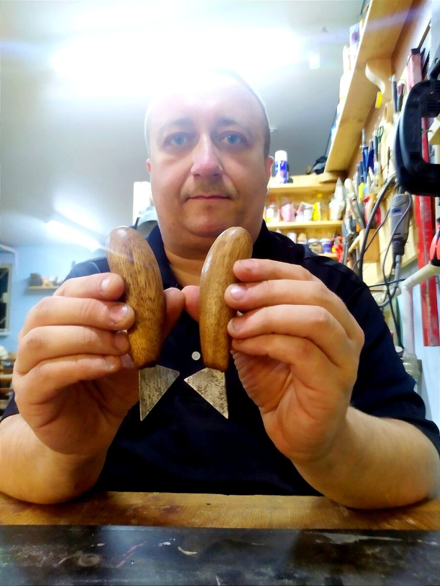 Я крайне редко изготавливаю инструмент самостоятельно. Но иногда всё-таки приходится это делать. Поступила заявка на два специальных детских ножика для резьбы. В ход идёт традиционная для этих целей мехпила. Слесарная обработка металла - это мягко говоря, не мой конёк. Но кажется что получилось относительно прилично. Рукоять склеиваю из старых паркетин неизвестного дерева. Остаётся только обработать ручку до нужной формы, покрыть маслом и заточить инструмент. Чехлы из бересты сделала моя коллега, Татьяна Хорькова. На этом всё! Оставайтесь на линии. Впереди ещё много интересного и разного!))