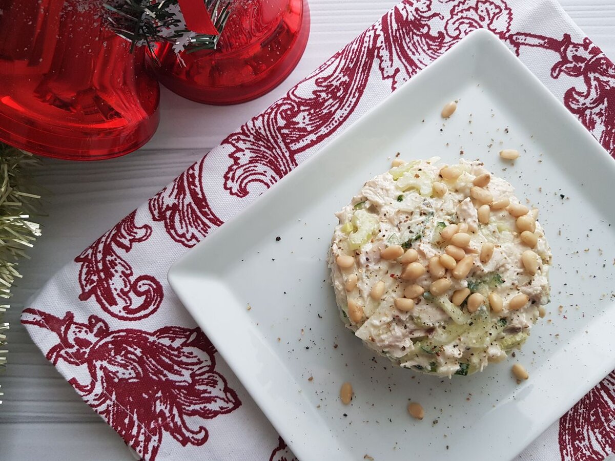 Продолжаю наш предновогодний марафон, и сегодня на очереди - салат! Что за Новый год без салата 😉 Вот только совсем не обязательно, чтобы он был тяжелым, жирным, калорийным и заправленным ведром майонеза. Название этому салату дали мои дети много лет назад, потому что почти все ингредиенты, входящие в состав - хрустящие. Кроме курицы. Прелесть этого рецепта - в простоте и универсальности. Салат "Хрустяшка" можно приготовить как к праздничному застолью, так и к обычному ужину (благодаря ингредиентам его можно съесть без зазрения совести даже вечером). Ингредиенты Курица варёная 250 г Сельдерей стебли 80 г Огурец свежий 80 г Яблоко зелёное 100 г Салат Айсберг 50 г Заправка Йогурт греческий 130 г Соус с базиликом 15 г Хрен 10 г Приготовление 1. Отварите курицу и разберите мясо на волокна. В этом салате мне нравится именно такая форма кусочков - не кубики, а соломка. 2. Сельдерей, огурец и очищенное от кожуры яблоко нарежьте тонкой соломкой примерно одинакового размера. 3. Салат Айсберг