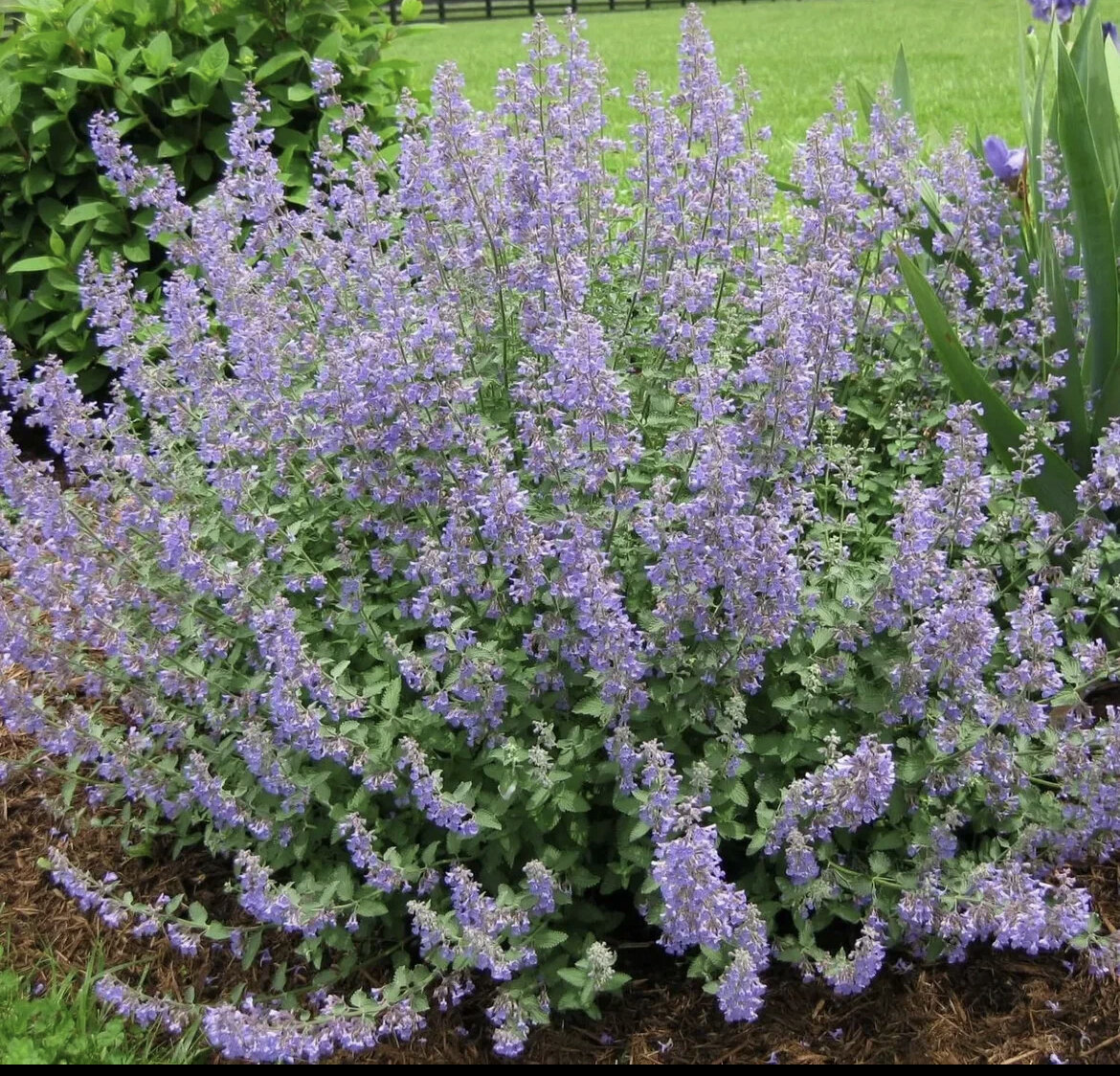 Очень мне хватало синего цвета в моей очередной композиции ( про нее отдельно поговорим) и изучив все цветы синего или голубого цвета, выбрала Котовник Фасена Уолкер’с Лоу Уолкер’с Лоу куст до 50 см в высоту и 40 см в диаметре, увенчанные крупными лавандовыми соцветиями красивого голубого цвета. Цветет месяц где то. Период цветения продолжается с июня по июль, сами кустики сильно разветвленные, имеют несколько побегов, что добавляет декоративности и пушистости этому сорту. Причем именно этот сорт цветет дольше других и вырастает выше других сортов. Засуха и мороз ему нипочем! В общем красивый, малоуходный и цвет нежный и кустиком пушистым растет - все что я хотела. Я знала, что в народе его называют еще «кошачьей мятой», т.е. его любят кошки. На вопрос а как же….тогда его растят.. Мне все наперебой отвечал - Да что вы! У нас растет 2, 4, 5 лет и кусты огромные уже… И кошкам все равно и внимания они на него не обращают и вообще мимо ходят! Все! Как вы думаете, на каком цветке леж