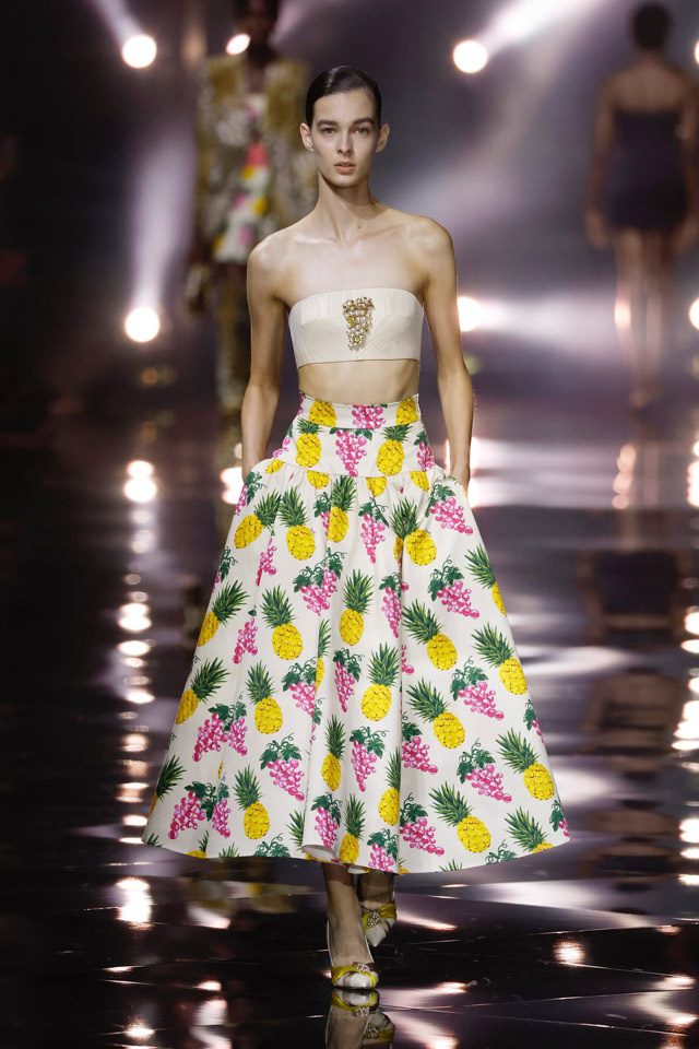 У бренда, который ассоциируется с роскошью и очевидной сексуальностью, мы видим принты в виде ананасов, почти как на советских конфетах, вкус которых знаком многим нам с детства. Фаусто Пульизи, креативный директор марки, уверен, что даже чувственные порывы можно выражать не только при помощи разрезов от бедра до ключиц. Кожаные ремни и корсеты мы все наблюдали уже бесчисленное количество раз и порядком от этого подустали.