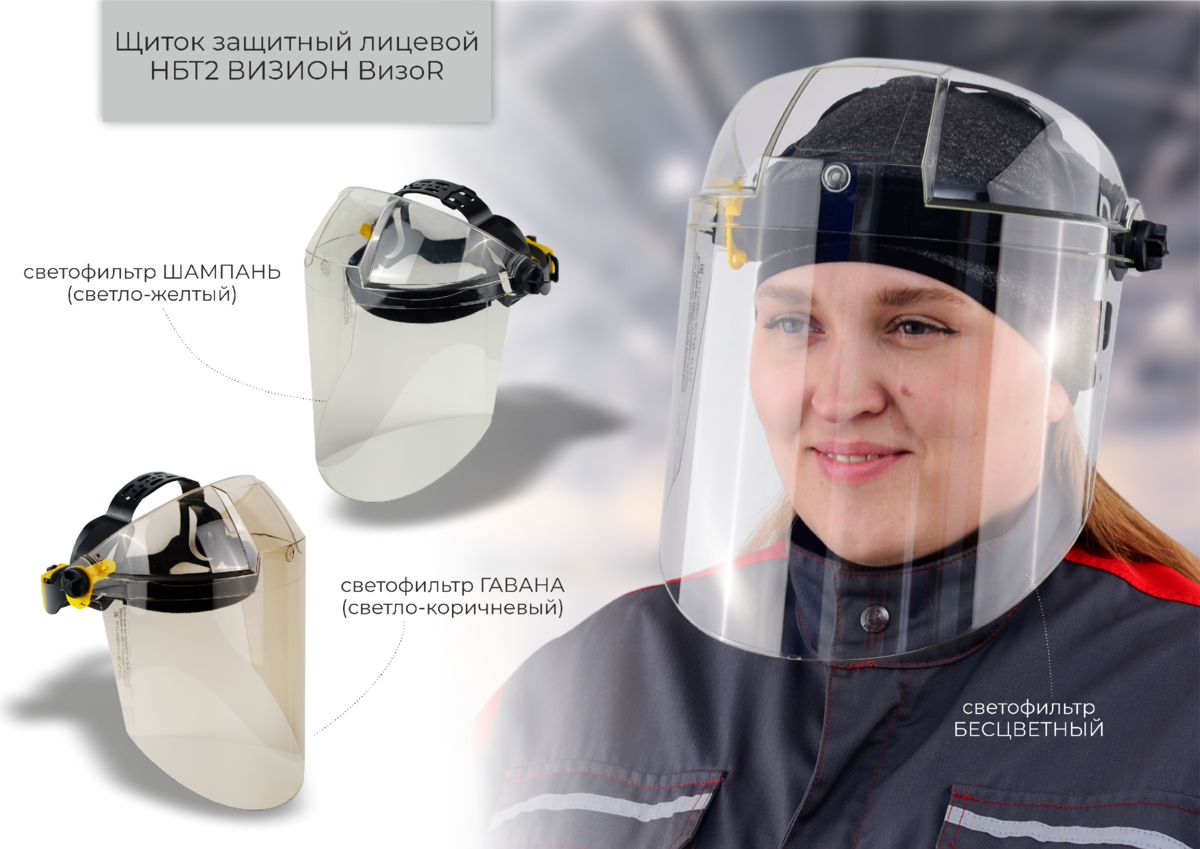 Щиток выпускается в трёх светофильтрах: БЕСЦВЕТНЫЙ 2-1,2 — улучшенная цветопередача, комфорт для глаз; ШАМПАНЬ (светло-желтый 2-1,2) — антибликовый, просветляющий, увеличивающий контрастность; ГАВАНА (светло-коричневый 5-1,4)