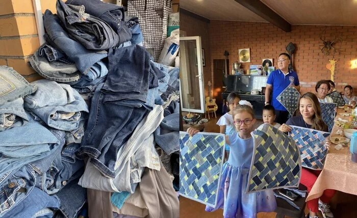 Баирма Харжеева создала проект «Плетём из джинсы», который развивает на средства гранта. Сама джинсы никогда не носила и детям не покупала. Сначала мы сами научились использовать её вторично, а благодаря нашему проекту обучаем этому население. Говорят, что легче выбросить, потому что из них ни тряпку не сделать, ни под ноги бросить - неудобно. В мастерской Баирмы проходят мастер-классы, на которые ходят и дети, и взрослые.