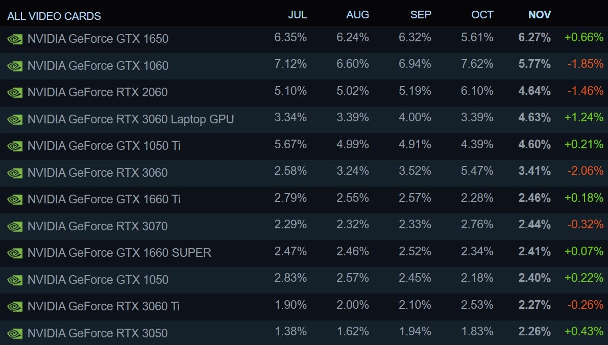 GTX 1060 больше не самая популярная видеокарта в Steam. Ее место теперь занимает GTX 1650