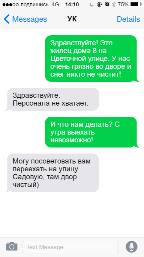 Раньше жильцы "воевали" с ЖЭКом, в современном мире мы сталкиваемся с управляющими компаниями. И хоть ликвидация ЖЭКа и подразумевала переход на более современную, эффективную и комфортабельный формат обслуживания, найти хорошую УК - это редкость. Некоторые полностью не выполняют свои обязательства, другие регулярно повышают цены и не предупреждают, третьи не отвечают на обращения жильцов. Поэтому общение с управляющей компанией на постоянной основе - довольно редкая вещь. Представляю вам подборку переписок с УК с забавными и довольно жизненными сообщениями. Совет, конечно, отличный. Но как переехать всем домом, всей улицей? Слишком жизненно: оглянуться не успеешь, как что-то уже подорожало... Некоторых людей хлебом не корми, только дай присвоить себе чужие старания. Сочувствие никому не помешает, однако так ворота не починятся. Хотя бы номер мастера бы дали... И смех, и грех. А с другой стороны - людям тоже хочется помыться, три дня сидят без воды... Возможно, вам также понравится: 5
