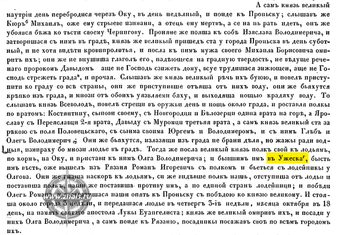 Упоминание о еще одном древнем городе Великого Рязанского княжества - Ужеск (Ожск) мы находим в Лаврентьевской летописи при описании событий 6715 г. (1207 г.) Ранее, в предыдущих публикациях, посвященных аналогичной теме, мы уже говорили о том, что поиски точного месторасположения древних рязанских городов является "уравнением со многими неизвестными". Ожск (Ужеск) в этом плане не является исключением. Да, он нем упоминается в летописях, но, к сожалению, этой информации недостаточно, чтобы точно указать на место, где он располагался. Несмотря на то, что летописи от корки до корки досконально изучаются специалистами и каждый из них имеет перед собой один и тот же исходный материал - выводы, к которым они приходят после его прочтения (изучения) очень часто разнятся. Так случилось и с Ожском. На сегодняшний день имеется четыре официальных версии месторасположения города: Большинством авторитетных голосов первый вариант считается маловероятным, т.к. следуя тексту летописи, город должен б