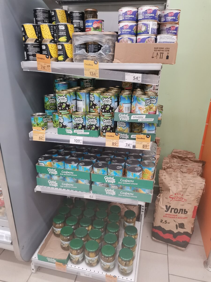 Быстренько пробежимся по ценам: у "Global Village" больше всего акций, так что начну с них - кукуруза сладкая за 74 рубля, горошек за 62, оливки с анчоусами/с креветками за 89, маринованные огурцы за 109; сардину от "Красной цены" мы увидим в магазине за 54 рубля, что дешево.