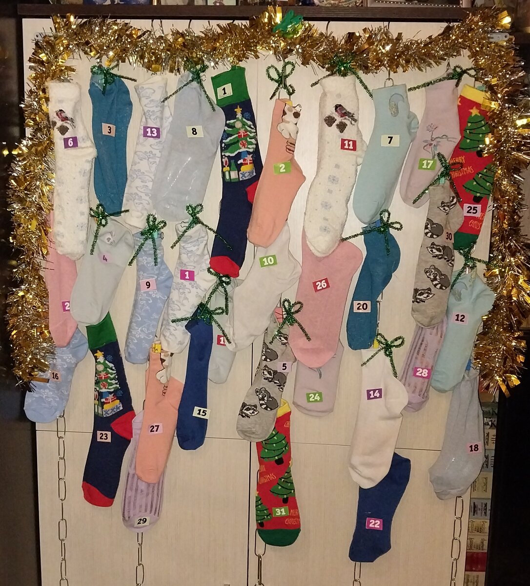 В этом году я второй раз делаю Адвент-календарь для Мамы, своими руками. Для тех, кто недавно на моём канале или хочет освежить память, в конце поста оставлю ссылки на календарь прошлого года и про сам адвент-календарь. В 2022 году я смогла реализовать идею, задуманную мной на 2021 год, тогда не получилось так как я не смогла набрать достаточного количества таких как я хотела ячеек для подарков, а также креплений для них. В этот раз я стала готовится, фактически, с января и постепенно, так что на этот раз всё получилось. Адвент-календарь 2022 получился скромнее, но на мой взгляд, уютнее. И опять свой рассказ я разделю на три части. 1 часть: Из чего сделан Адвент-календарь. 2 часть: Чем наполнен Адвент-календарь. 3 часть: Как украшен Адвент-календарь. А теперь обо всём по порядку. 1 часть. Идеей сделать из носочков ячейки календаря я хотела ещё в прошлом году, но возникла загвоздка с тем, как их крепить, я решила для этой цели воспользоваться цепочками, на которые крепят одежду на вешал