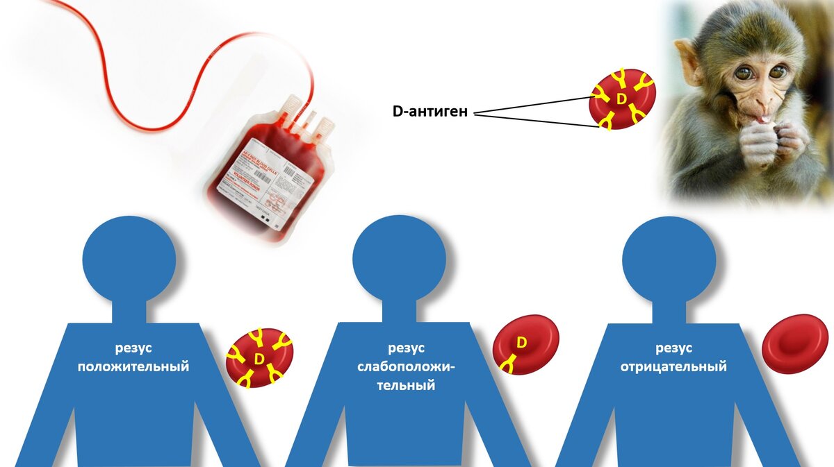 Вчера мы думали, что положительный резус фактор крови - это когда в мембранах эритроцитов человека содержится точь-в-точь такой же белок, как и в мембранах эритроцитов макак-резусов. Ну а если в мембранах эритроцитов нет этого самого белка, то кровь у человека резус отрицательная. И что? Правильно мы думали. Только оказалось, что в эритроцитах крови вовсе не один, а множество (около 60) белков определяют резус-фактор. Замечу, что наибольшее влияние на этот признак оказывает всё-таки один из всего этого множества белков и именно этот белок ищут в образце нашей крови. Этот белок называют D-антигеном. Так вот, у примерно 15% людей D-антигена в крови нет (у них резус отрицательная кровь). У 85% - он есть (эти резус положительны). Но у 1% из резус положительных людей D-антигена в эритроцитах очень мало, поэтому из-за несовершенной старой методики он то обнаруживался при анализе, то нет. Вот про таких-то людей и говорят, что у них слабоположительный резус-фактор, и благодаря более точной методике исследования искомый белок у них сегодня находят.