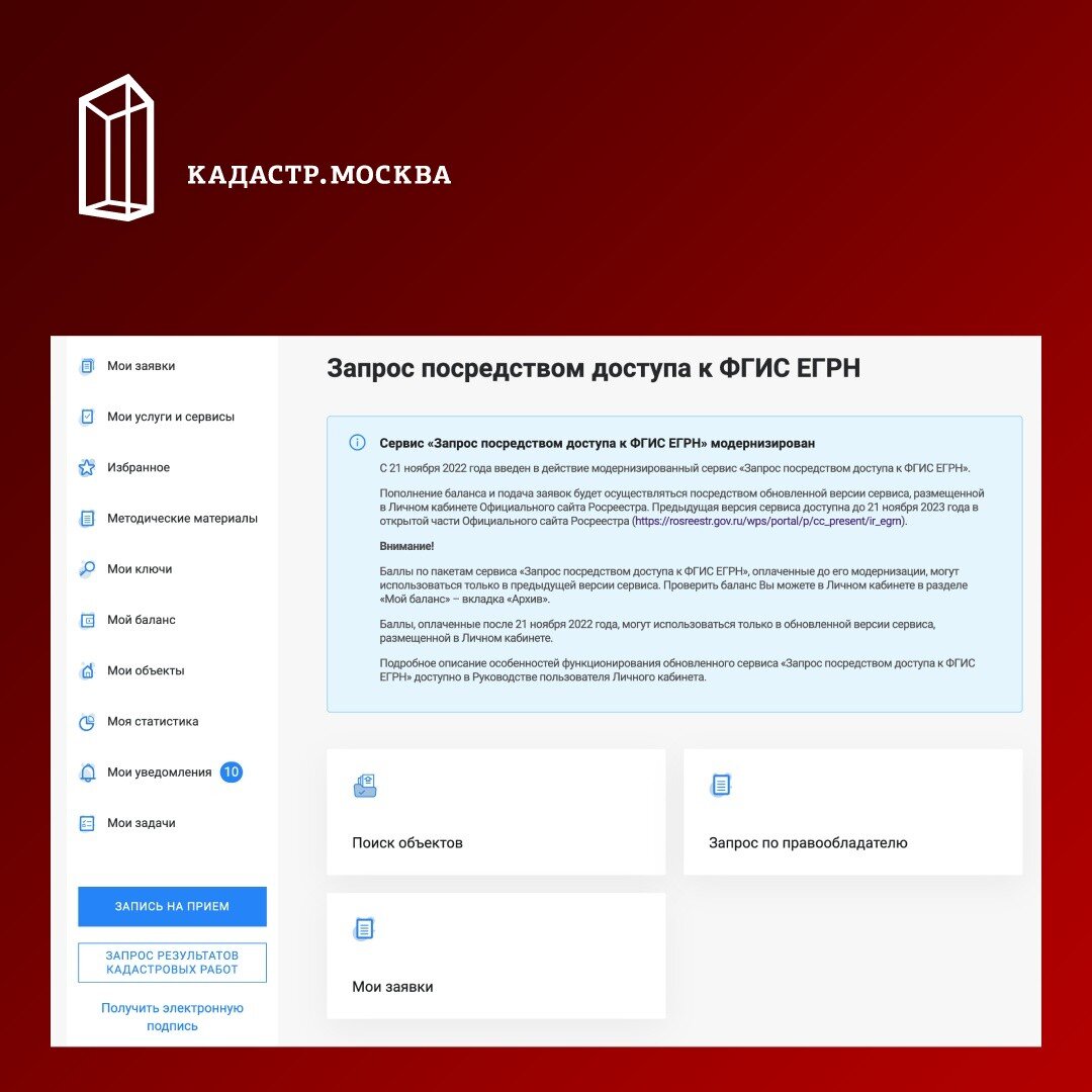 С 21.11.2022 сервис «Запрос посредством доступа к ФГИС ЕГРН» доступен в разделе «Мои услуги и сервисы» в личном кабинете на портале Росреестра по ссылке https://lk.rosreestr.ru/request-access-egrn Ожидается, что старый сервис будет отключен через год, 21.11.2023. Для заказа выписок необходимо: Что можно отметить: Заметим, что с 01.03.2023 выписки будут включать в себя графическую часть (план, чертеж, схему) по выбору заявителя (Приказ Росреестра №П/0204 от 04.06.2022). Возможно, это будет влиять на скорость или стоимость предоставления данных. Ссылка на новость: https://кадастр.москва/news/924 ---------------------------------------------------------------------------------------- Будем рады вашим вопросам по кадастровому учёту и регистрации права, а также обоснованным замечаниям по опубликованным материалам. Комментарии, не относящиеся напрямую к теме статьи или канала, а также выражающие неуважение к собеседникам, могут быть удалены. Спасибо за ваше понимание. Все наши статьи читайте