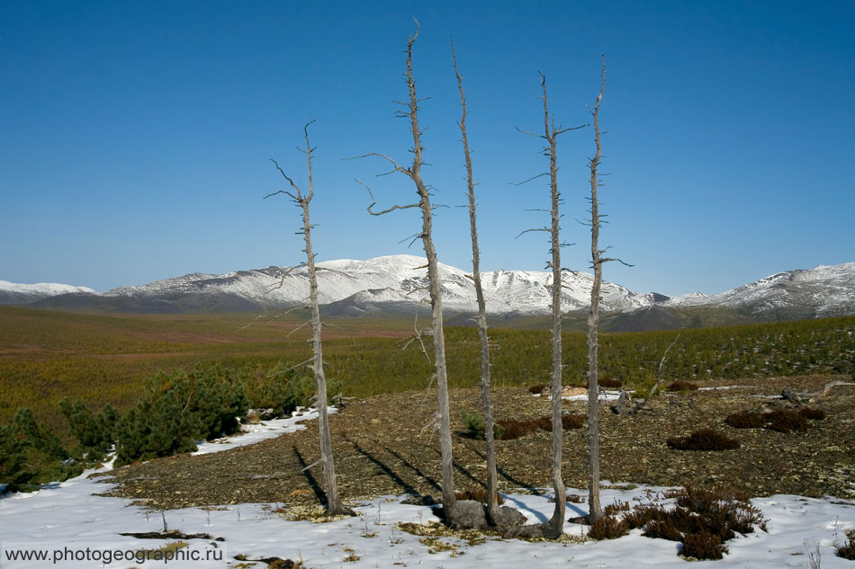 Из серии - Фотоэкспедиция в Колымские края. (Чтобы понять общую суть повествования, ткните на эту ссылку) ПРЕДЫДУЩАЯ ЧАСТЬ Если последняя неделя августа выдалась очень тягостной из-за непогоды и вынужденного простоя, то первые дни сентября оказались очень напряжёнными по причине того, что установилась замечательная погода, и нужно было фотографически осваивать окружающее пространство. Но это было в радость. Похоже, не только я засиделся, но и осень после внеочередной зимы резко стала набирать в цвете, а свежие пятна снега на контрасте ещё более делали мир ярким и красивым, хотя и с некоторым привкусом грусти. Надо сказать на этот раз обосновался совсем неплохо. Славкина избушка, конечно, тесновата, но на одного человека вполне места хватает. А главное есть печка и даже небольшие запасы угля. Днём теперь солнечно и даже относительно тепло, зато по ночам начались законные осенние заморозки. К утру, вода в лужах стала превращаться в лёд. Так что печка теперь особенно актуальна. Кроме то