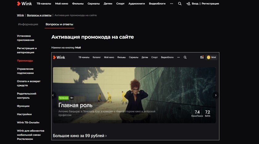 На Wink действует система промокодов. Они активируются при оплате подписки. Использование кода позволяет уменьшить плату по тарифу на срок от одного до нескольких месяцев или сделать просмотр кино и сериалов совсем бесплатным. Также промокоды могут давать пользователю определенные привилегии, например предоставлять доступ к дополнительному контенту, который не входит в подписку по умолчанию. Актуальные промокоды Wink можно найти здесь.