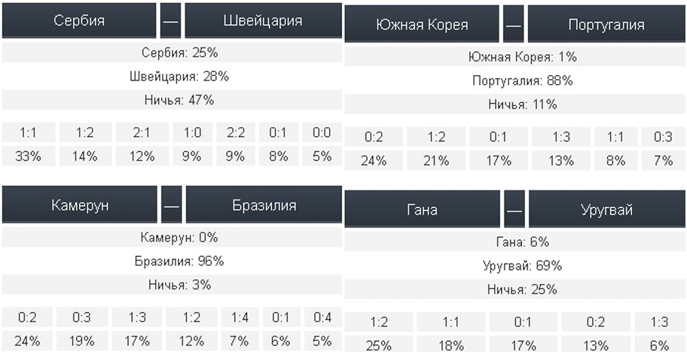 25% участников конкурса прогнозов чемпионата мира-2022 на pressball.by считают, что сборная Сербии победит в игре против сборной Швейцарии. На викторию швейцарцев ставят 28%, на ничейный результат самые высокие шансы — 47%. Самый популярный счет, который предполагают прогнозисты — ничья 1:1 (33%). Матч третьего круга группы "G" состоится в 22:00 по минскому времени. Сегодня завершится групповой этап чемпионата мира-2022 в Катаре, где в плей-офф осталось два вакантных места. Так, помимо сборных Сербии и Швейцарии, свой поединок в 22:00 начнут футболисты Бразилии и Камеруна. Напомним, что "пентакампеонес" досрочно вышли из своего квартета. В группе "Н" за место в 1/8 финала сборная Уругвая поборется со сборной Ганы, а южнокорейцы сыграю против пробившихся в плей-офф португальцев. Стартовый свисток двух матчей прозвучит в 18:00 по минскому времени. Специальный бонус всем новым клиентам fonbet.by — фрибет 30 BYN + 30 фриспинов по промокоду BALL. Регистрируйтесь с промокодом BALL, пополняйт