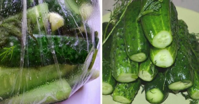 Иногда хочется огурчиков малосольных, а в магазин лень бежать. Можно сделать быстренько и при этом очень легко делать. Берем огурцы, если они большие, то режем на 4 части, обязательно отрезаем попки, чтобы не горчили. Берем пакет пищевой, кладем туда огурцы. Можно добавить укроп, дольки чеснока. Сыпем в пакет 1-2 чайной ложки соли (смотрите сами в зависимости от количества огурцов) Завязываем пакет и трясем, тщательно перемешиваем. Оставляем в холодильнике, обязательно в глубокой миске, мало ли сок будет вытекать из пакета. Часа через 3 уже можно есть готовые малосольные огурцы. Приятного аппетита!