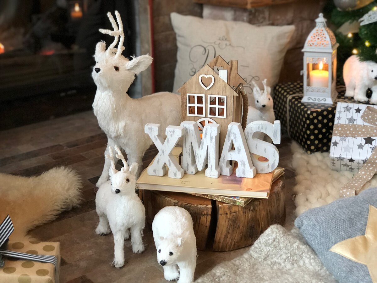 Если Новый год у вас ассоциируется с уютным домиком, где есть камин, теплые ковры на полу, а в центре комнаты сияет ёлочка — то вам понравится наше оформление под ключ в стиле шале! Напоминаем, что это полностью готовая услуга — закупаем декор, приезжаем и оформляем. Все будет в том же стиле, что и на фото, но адаптировано под ваш дом, квартиру или офис. Конечно, если у вас дом с деревянной отделкой стен — смотреться будет намного выигрышнее! Наш декоратор Женя играла на сочетании теплой древесины и холодных белых тонов. Вязаные пледы, корзинка с клубками, фигурки животных и яркие огоньки — все это подарит ощущение невероятного уюта! Каждая деталь играет свою роль и дополняет композицию: будь то деревянный домик, пушистый белый мишка или пенёк, на котором лежат новогодние сказки. А здесь мы собрали тематический декор, которым можно украсить другие комнаты и праздничный стол на Новый год!