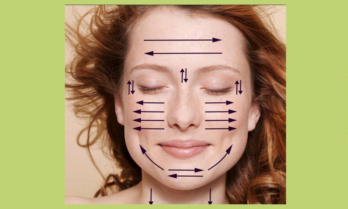 Начать массаж лучше с верхней части лица. Пальцы рук располагаются в центре лба, затем с легким нажимом продвигаются к вискам и возвращаются в исходную точку. Движение нужно повторить 6-10 раз. При массаже ощущается приятное тепло, возможно легкое покалывания, но не боль.