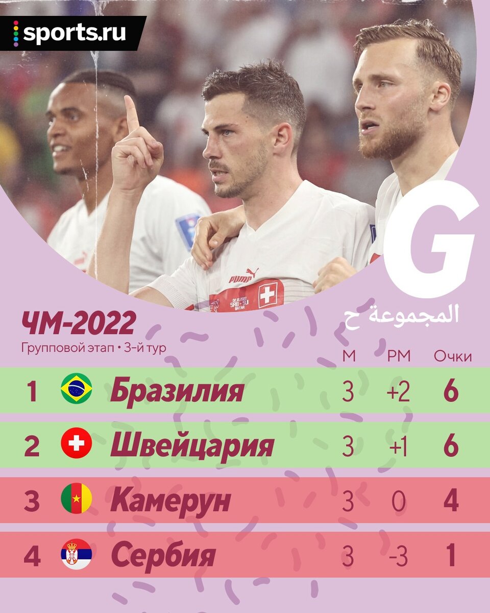 Швейцария камбэкнула и вышла. Групповой этап ЧМ-2022 закончился. Эффектно закрыли его команды из группы G. Было любопытно, но закончилось без сенсаций. Бразилия обеспечила себе место в плей-офф еще по итогам второго тура, поэтому на Камерун Тите ротировал состав. Нашлось место даже 39-летнему Дани Алвесу. В итоге забить не смогли, а на 90-й пропустили. Кстати, именно Камерун нанес первый удар в створ ворот бразильцев на этом ЧМ. И даже так Бразилия вышла из группы с первого места. Правда, был риск потерять первое место – если бы пропустили еще один или швейцарцы выиграла в два мяча, именно европейская команда поднялась бы выше. Швейцария заслуженно вторая. Дожали Камерун, чуть-чуть не сдержали Бразилию и вырвали победу с сербами. Снова забил Джердан Шакири – стал третьим игроком, забивавшим минимум по голу на каждом из последних трех ЧМ (вместе с Месси и Роналду). По ходу матча сербы даже вели в счете 2:1, но в итоге проиграли. Любопытно, что не получилось даже отцепить Швейцарию – как