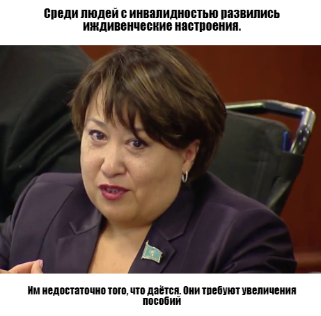 Вместе с тем Л. Калтаева, член партии "Нур Отан" + парткомиссии + СУСН этой же партии утверждает, что просьба о повышении пособий - это есть ИЖДИВЕНЧЕСТВО!